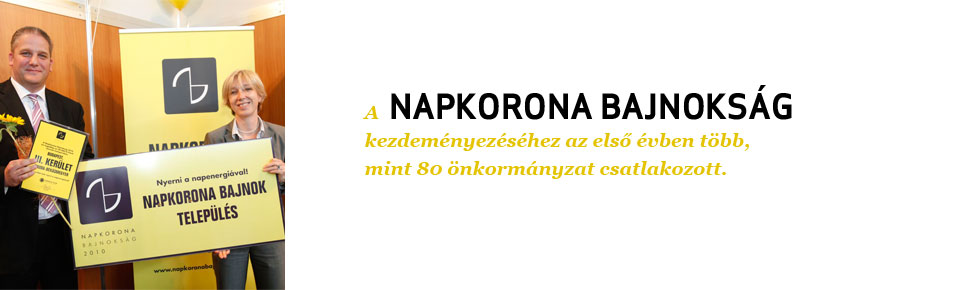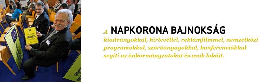2015-ben újra indul a NAPKORONA BAJNOKSÁG az Energiaklub szervezésében.Ismét keressük Magyarország legnaposabb települését. Nevezzen és nyerjen az ország legnépszerűbb napenergiás versenyén, a NAPKORONA BAJNOKSÁGON!Ha az önkormányzat fejlesztésében jelentősebb, napenergiát hasznosító beruházások történtek településén, néhány adat megadásával tájékoztasson bennünket, és máris részese a versenynek.A versenyben az egy lakosra jutó legnagyobb szén-dioxid-megtakarítást elérő önkormányzatot díjazzuk....
